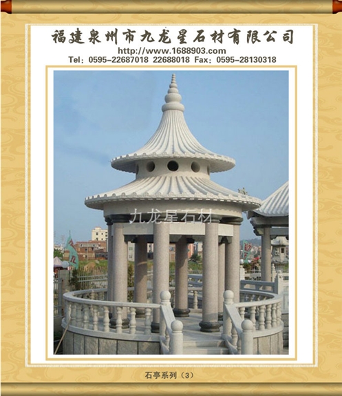 2、石雕涼亭大小要與園林、住宅大小匹配,距離要合適,形狀應(yīng)以圓形、方形、五角、六角以及八角為主,忌奇形怪狀者。