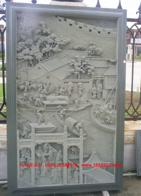 3、 沉雕。又稱"線雕",即采用"水磨沉花"雕法的藝術(shù)品。此類雕法吸收中國(guó)畫與意、重疊、線條造型散點(diǎn)透視等傳統(tǒng)筆法,石料經(jīng)平面加工拋光后,描摹圖案文字,然后依圖刻上線條,以線條粗細(xì)深淺程度,利用陰影體現(xiàn)立體感。此類產(chǎn)品多數(shù)用于建筑物的外壁表面裝飾,有較強(qiáng)的藝術(shù)性。