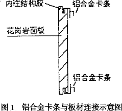 石材施工工藝流程為:定板材的尺寸---對(duì)板材進(jìn)行開槽---注膠前清潔---用結(jié)構(gòu)膠將掛件與花崗巖板材粘結(jié)(如圖1所示)---結(jié)構(gòu)膠固化---板面清理---板塊排版。