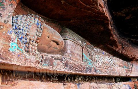 臥佛院摩崖造像位于四川省安岳縣城北面25公里的八廟鄉(xiāng)臥佛溝,以其臥佛大像和石刻佛經(jīng)聞名于世。臥佛鐫刻在距地面5米的崖壁上,全長(zhǎng)23米,頭長(zhǎng)3米,肩寬3.1米。它 背北面南,頭東足西,左側(cè)而臥。臥佛形體修長(zhǎng),身著袈裟,面部豐盈,神態(tài)安祥,雙目微閉,似睡非睡,展現(xiàn)出釋迦牟尼涅槃時(shí)那超脫一切的意境。臥佛溝南面的 石壁上,有15窟經(jīng)龕,規(guī)模大小不等??探?jīng)面積達(dá)130多平方米,經(jīng)文目錄繁多,內(nèi)容極其豐富。主要經(jīng)目有《大唐東京大敬愛寺一切經(jīng)論目序》、《佛名 經(jīng)》、《大般涅槃經(jīng)》、《般若波羅密多心經(jīng)》、《佛頂尊勝陀羅尼經(jīng)》、《妙法蓮花經(jīng)》等。這裡是我國寶貴的石刻經(jīng)庫。 (資料來源:石工坊雕刻)