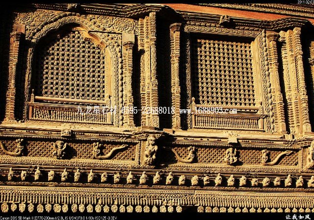 傳統(tǒng)的尼泊爾建筑,都使用雕刻木件,王宮和廟宇建筑自不必說,就是普通民居也是如此。使用雕刻木件處,主要是一些外露部分,如門、窗、廊柱、欄桿、屋頂及廊頂?shù)膿沃???梢哉f,凡是外露的部分,有木件就有雕刻,而且都是人工雕刻。