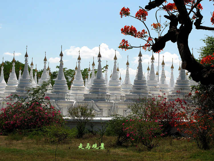 阿都瑪希寺廟里,由729塊大理石雕刻成的經(jīng)書,組成了整齊圣潔的佛塔,在陽(yáng)光和鳳凰樹紅色花球的環(huán)繞中,看著這些潔白的石經(jīng),心里會(huì)有平靜浮起。