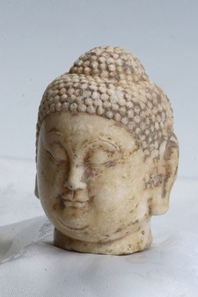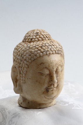 佛造像是佛教的載體,通過(guò)對(duì)佛造像年代、工藝、造型及風(fēng)格的研究,有助于認(rèn)識(shí)和了解古代雕刻藝術(shù)、文化史,古人的審美情趣以及古代的政治、經(jīng)濟(jì)和科技發(fā)展水平。縱觀佛造像制作材料,有木制、泥塑制、金屬制、牙骨制、陶瓷制和石制。其中以石刻雕制的難度最大,因?yàn)樗婕笆系倪x擇、開(kāi)采、運(yùn)輸,體大量重,雕刻打磨實(shí)屬不易。唐代石刻佛造像是把人與精神、現(xiàn)實(shí)與理想完美地結(jié)合在一起的最佳表現(xiàn)形式。那么就請(qǐng)大家一同欣賞這尊唐代漢白玉佛首的神韻和藝術(shù)感染力以及由此帶給我們大家的宗教、歷史、文化等方面的信息吧。