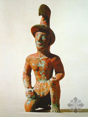 新疆新源縣境鞏乃斯河南岸也出土有寫實的銅人,作蹲跪姿勢。頭戴尖頂寬沿帽,大眼高鼻,有鮮明的民族特征。裸上身,下體著短裙,赤足。兩手分握管狀套筒,與中原地區(qū)所出土的,作為器物支架或底座的人物相近。這件作品準(zhǔn)確地塑造出健壯、富有彈性的肌肉,和骨骼與肌肉的解剖關(guān)系,再現(xiàn)了當(dāng)時塞外武士的勇武風(fēng)范,是同時期雕塑作品中少見的。