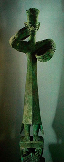 春秋以后的青銅器以人形為支架的逐漸多了起來,重要的代表作品有湖北隨縣曾侯乙墓所出的一組鐘架銅人,還出土蟠龍建鼓座。在河南洛陽金村的東周墓葬中出土有銅、銀、玉等不同材質(zhì)的人物形象。還有江蘇漣水三里墩所出的銅臥鹿。這些都是戰(zhàn)國時期的作品。