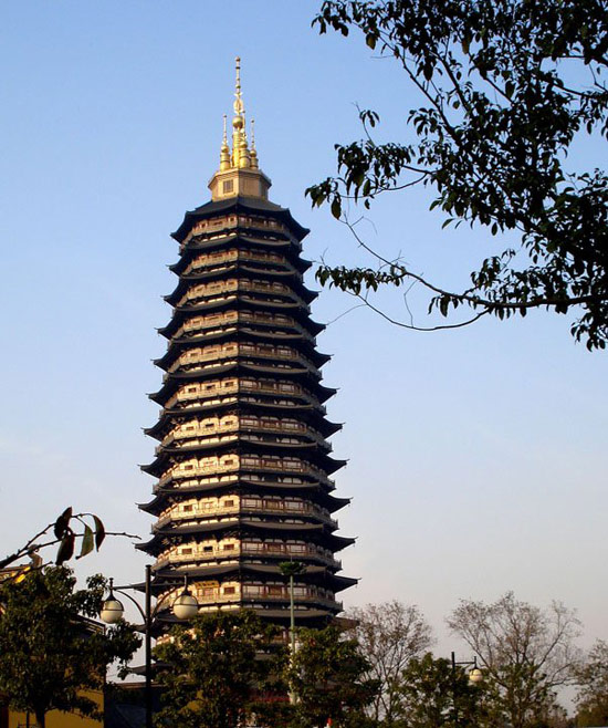 天寧寶塔乃中華第一佛塔(全球最高佛塔)位于江蘇省常州市天寧寺內(nèi)。天寧寶塔始建于2002年4月,于2007年4月30日開光??偨娣e2.7萬平方米,塔高13層153.79米,為國內(nèi)4000多座寶塔之最;從底層地宮到頂層鐘樓,整座寶塔以佛教文化為主線,以東陽木雕、揚州漆器、常州亂針繡、惠安石雕等手工藝術為表現(xiàn)手法,巧妙地詮釋了大乘佛教的諸多教義。佛塔的建成,與北方云崗大佛、中原龍門大佛、西方樂山大佛、東方靈山大佛、南方香港天壇大佛遙相呼應,成為五方五佛的佛心。