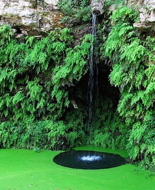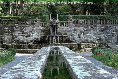 踏上三層臺地后順著長方形水池向半圓形噴泉望去。站在這一觀賞點(diǎn)總能給人驚喜,就像整幅油畫掛在眼前。兩個巨大河神分守兩旁的半圓形水池顯得那么的神秘幽深,配以長方形水渠,就像回到了過去。