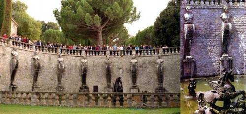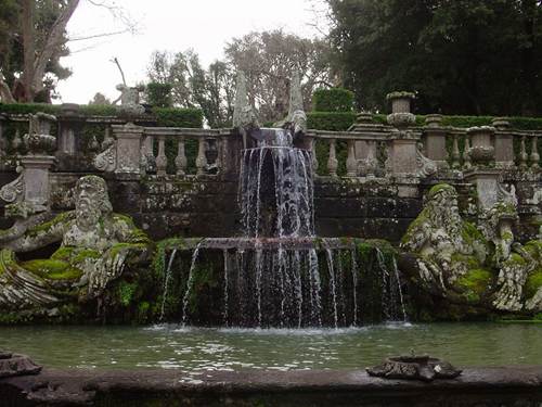 噴泉:蒙塔爾托主教入主別墅時期,他按照當(dāng)年維尼奧拉的整體設(shè)計,繼續(xù)建造花園的中央噴泉--意大利風(fēng)格主義雕塑家詹博洛尼亞(1529-1608)設(shè)計建造的"摩爾噴泉":4個石欄圍繞的水池,石欄上矗立著石雕花瓶,4個水池中央便是一組高聳的年輕運(yùn)動員的輝煌雕塑,他們高高舉起象征著蒙塔爾托主教家族姓氏的"阿爾托山"。從遠(yuǎn)處看去,這些有力的塑像十分宏大,黑黝黝地閃耀,以至于人們會認(rèn)為它們是青銅,可是難以置信的是,它們是最好的、最堅硬的石灰華在陽光與水的作用下生成的一種堅硬如鐵的物質(zhì)。后來意大利新古典主義雕塑大師卡諾瓦來到這里時,大為驚訝,他一邊拿起錘子輕輕敲打著它,一邊發(fā)出如此的感嘆:"它將比大理石更長久"。