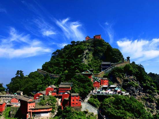 武當(dāng)山又名“太和山”,位于中國中部湖北省丹江口市的西南部。相傳為道教玄武大帝(北方神)修仙得道飛升之勝地, 歷代道教名流曾在此修煉。據(jù)記載, 唐太宗貞觀年間即在靈應(yīng)峰創(chuàng)建五龍祠。宋、元以來, 代有開拓?cái)U(kuò)建。明成祖于永樂十年(1412)曾動用軍夫30多萬人在此大興土木。現(xiàn)存的36處宮觀大多是明代所建, 是中國現(xiàn)存最完整、規(guī)模最大、等級最高的道教古建筑群。宮觀內(nèi)保存的各類神像、法器、經(jīng)籍等都有較高的文物和藝術(shù)價(jià)值。明代(公元1368~1644年)時(shí),武當(dāng)山被皇帝敕封為“大岳”、“玄岳”,地位在“五岳”諸山之上。武當(dāng)主峰天柱峰,海拔1612米,周圍又有“七十二峰”、“三十六巖”、“二十四澗”等勝景環(huán)繞,風(fēng)光旖旎,氣勢宏偉,被世人贊為“萬山來朝”。
