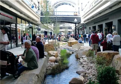 溪流石景使城市商鋪中多了自然元素,成為一道別致風(fēng)景線,吸引更多人前來(lái),同時(shí)提供了沿路休息的座位。