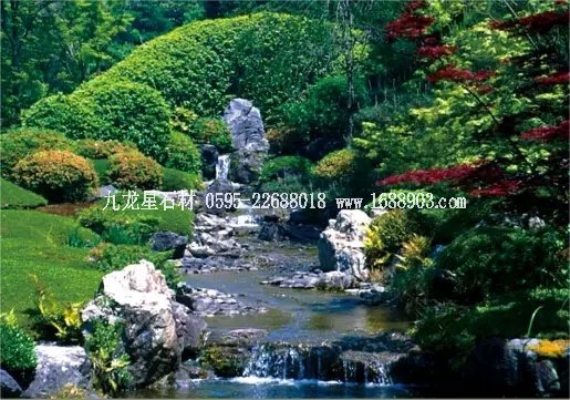 利用高差做出層次豐富的跌水溪流,在兩側(cè)不同種類的植物的掩映中,溪流源頭更顯深邃神秘。