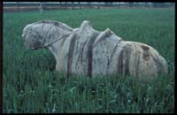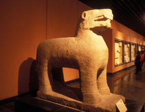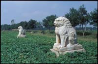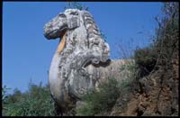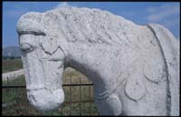 古代陵園石雕遺存實物最早的是引人注目的西漢霍去病墓石雕,作品原在陜西省興平縣漢武帝茂陵東面霍去病墓上與墓前。現(xiàn)已發(fā)現(xiàn)的石雕作品有造型各異、天趣宛然的動物、人物等共十四件。霍去病為西漢名將,漢武帝為表彰其功、紀(jì)念其人,于茂陵東面選定其墓址并“為冢象祁連山”,據(jù)《史記?衛(wèi)將軍驃騎傳?索隱》記:其墓“冢上有豎石,前有石馬相對,又有石人”。今存作品即記載中的部分原物。它們可以分為兩類,一是通常被稱之為“馬踏匈奴”的立馬,二是其它渚石。立馬的原在位置是墓前不遠(yuǎn),長年來未有大的移動,從形式上看為靜立姿態(tài),尺度適中,符合一般早期墓前石雕的制作規(guī)律,相信此即記載中相對而立的石馬,只是另一件已無存,“石人”也不見了。唐薛逢《漢武帝祠》詩云:“茂陵煙雨埋弓箭,石馬無聲蔓草寒”。詩中所指茂陵石馬當(dāng)系帝陵制度,但與霍墓立馬的位置及造型表現(xiàn)肯定有直接關(guān)系。西漢時期陵園墓前設(shè)置石雕已成風(fēng)氣,關(guān)于石人石獸的記載與遺存并不罕見,因此霍去病墓前石馬并非例外,實屬常規(guī)設(shè)置,它為我們提供了代所完善的石象生設(shè)置與造型形式之源的現(xiàn)知最早實物證據(jù)。