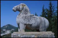 藏王墓位于西藏自治區(qū)瓊結(jié)縣,是公元七——九世紀(jì)歷代吐蕃贊普的墓葬群,現(xiàn)存石獅一對和石碑、柱等。造型除受中原影響外,樣式特征亦帶有波斯風(fēng)格影響。