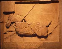 “昭陵六駿”,與其說是表現(xiàn)雕刻的美不如說是表現(xiàn)繪畫的美。據(jù)記載,昭陵是在杰出美術(shù)家閻立德主持下修建的,并由其弟閻立本圖繪十四國君長像為石刻范本?,F(xiàn)存十四國君長像頭部殘塊顯示的確有寫真特征,面部皺紋用線刻形式加以表現(xiàn),甚至眼角的紋路亦不放過,形象追求“寫真性”,突出個人的容顏特點,在某種程度上帶有一定的摹刻繪畫性,不同于一般的石人?!傲E”所表現(xiàn)的是唐太宗征戰(zhàn)慣用的六匹戰(zhàn)功馬,宋游師雄題《六駿碑》中記述了石刻當(dāng)時安置的次序:颯露紫(西第一)、特勒(勤)驃(東第一)、拳毛馬咼 (西第二)、青騅(東第二)、白蹄烏(西第三)、什伐赤(東第三)?!傲E”表現(xiàn)為類似于漢畫象石刻中浮雕的形式,在方形外框中刻畫馬的側(cè)面形象,韻致非常接近于唐代繪畫中馬的表現(xiàn)?!傲E”是具體指象,即“刻石為常所乘破敵馬六匹”(《唐會要?卷二十》),有形象的特定要求,而且選擇了戰(zhàn)馬中箭、奔馳、療傷的情節(jié)并刻畫出了馬頸部的“三花紋”這類細(xì)節(jié)。這都宜于繪畫表現(xiàn)而不宜于圓雕表現(xiàn)。既然人像石雕可以繪畫為范本,馬的石雕當(dāng)然也完全可能以繪畫為范本。昭陵沒有效法圓雕形式表現(xiàn)鞍馬,原因之一就在于類似畫象石的浮雕形式更便于傳達(dá)繪畫性表現(xiàn)內(nèi)容,避免圓雕所受的材料限制,從而傳達(dá)“六駿”特有的紀(jì)實性審美意味。