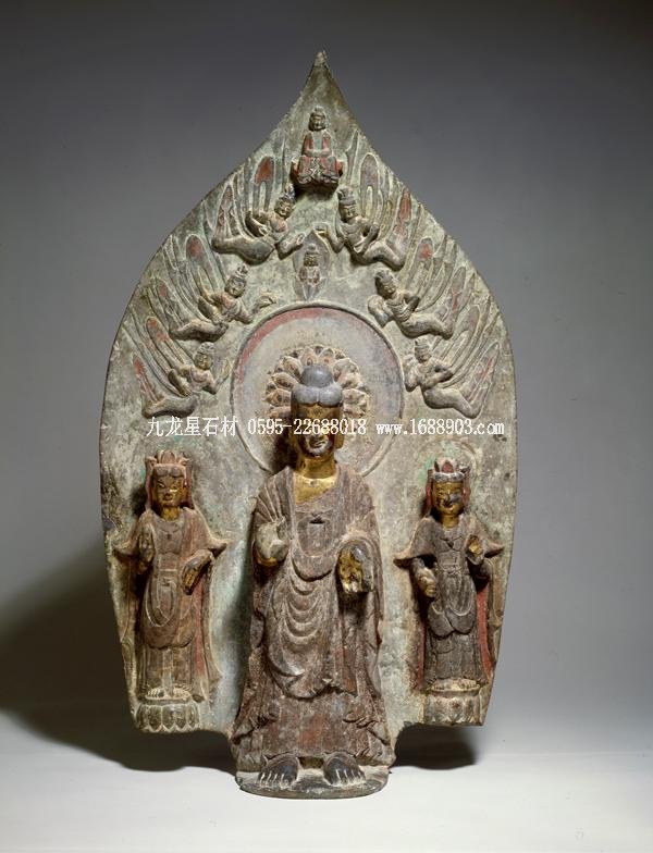 4至6世紀的南北朝是中國佛教造像的啟蒙和黃金時代,尤以制作精美的北朝造像聞名于世。北魏晚期佛像造型已顯成規(guī),表現(xiàn)為軀體趨平板狀,線條概括、洗練,又富裝飾性,加上長眉、細眼及抿唇微笑的臉相,洋溢著一種既莊嚴又清秀的審美品味。館藏的佛三尊立像是這一時期造像碑作品的典范。