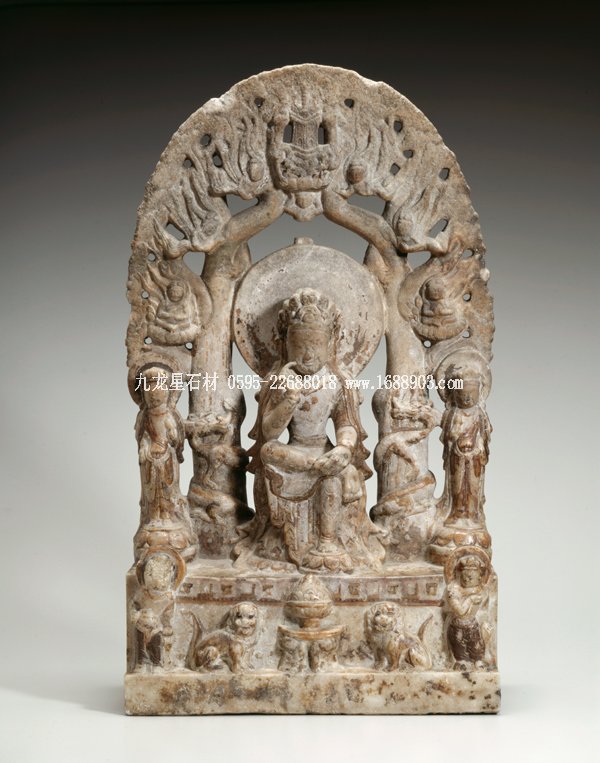 館藏思維彌勒像雖運用成規(guī)的造像碑格式和構圖,但設計制作別具一格。用鏤空技法雕出一庭園背景,為白色的大理石作品更增添了一種清新和輕盈的視覺效果。彌勒左腳踩蓮座,半跏趺坐于兩棵大樹之間。樹干有龍盤繞,兩樹枝葉相纏構成圓拱形背屏,又有四飛天簇擁一方塔于中央。這些細節(jié)是彌勒經(jīng)典形象的描繪,彌勒在龍華樹下成佛,方塔即釋迦牟尼的舍利塔。蓮座和方塔象征彌勒是釋迦佛的繼承人。彌勒臉形方圓,戴頭冠和瓔珞,軀干和四肢分明,肩臂圓潤,薄裙貼體。兩旁有脅侍菩薩,腹部前凸,一腿側(cè)立,膝蓋略彎,作稍息站勢,開啟了后代菩薩形體造型的新風尚。人物造型是漢化和受印度笈多佛雕(Gupta)風格影響的產(chǎn)物。此尊造像是北齊時期題材和雕刻巧妙結(jié)合的典范。