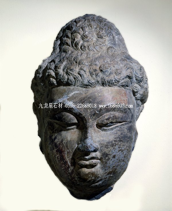 河南龍門石窟的擂鼓臺三洞建于武周和盛唐時期。館藏的佛頭像原屬其一洞窟中的大佛。佛有漩渦發(fā)型,高肉髻,臉龐圓潤飽滿,眼呈俯視之態(tài),眼瞼微合,眼珠點黑彩,神態(tài)自信沉著。根據(jù)頭像的碩大尺寸可知原大佛應高高在上。由此,若從仰視的角度再看這尊頭像,佛的容顏就變得更溫和親切,實可為原設計之本意。獨特的創(chuàng)意和純熟的雕刻技法,是盛唐造像得以具備高度寫實性和表現(xiàn)性的原因。