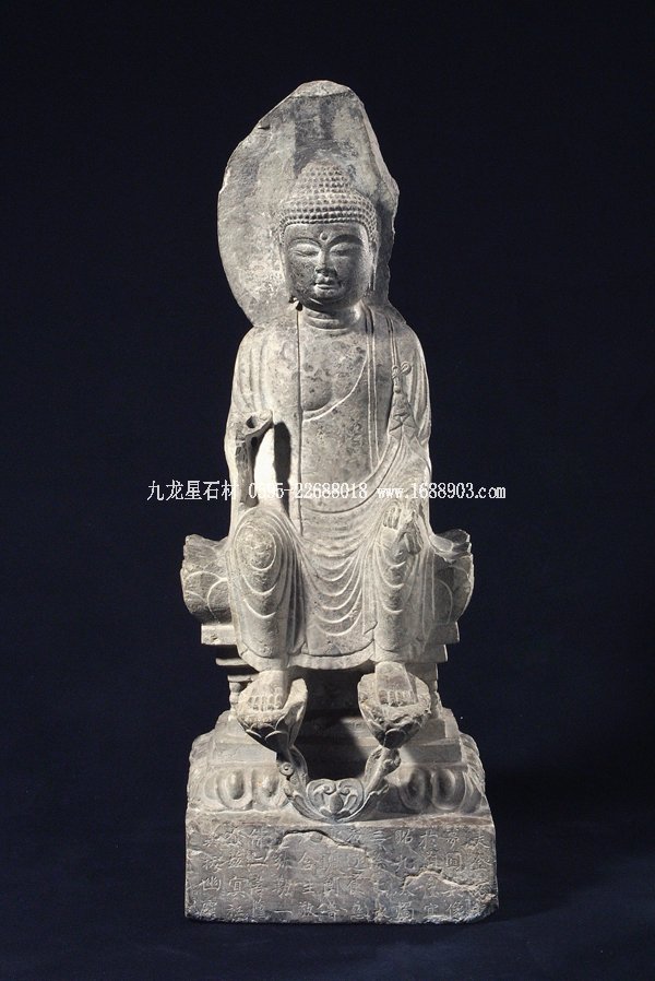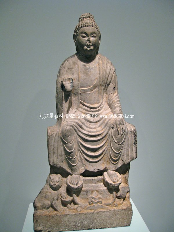 從北齊開始,中國石雕佛像趨向肢體、衣飾質(zhì)感的細節(jié)刻畫。至8世紀的唐代,佛像造型越顯自然寫實,雕刻技法精湛,從而形成中國式佛像的模式。館藏的兩尊彌勒佛堪稱初唐時期的佳作。未來佛彌勒在形態(tài)塑造上與釋迦佛幾乎無異,不同之處在于彌勒佛的坐姿和手勢。彌勒佛不是盤腿結(jié)跏趺坐而是倚坐,即雙腳下垂踩蓮花。其手勢基本上有兩種:一種同交腳彌勒菩薩的手勢,左手握衣角,按左膝,右手作無畏或說法印;另一種是一手心向下按膝,一手作無畏或說法印。這兩尊彌勒佛方額廣頤,臉頰豐滿,衣裟透體,衣紋刻畫生動流暢。整體造型嚴整自然,神態(tài)顯得平易安詳。