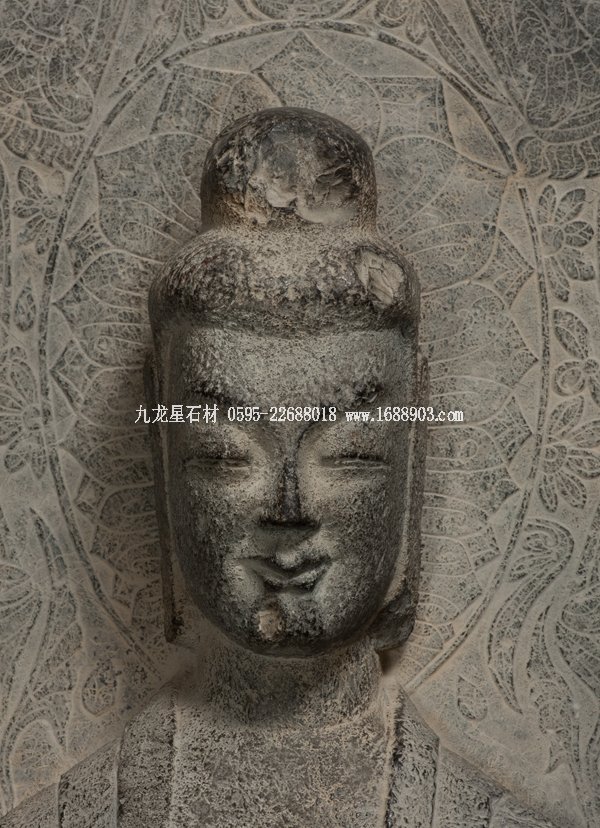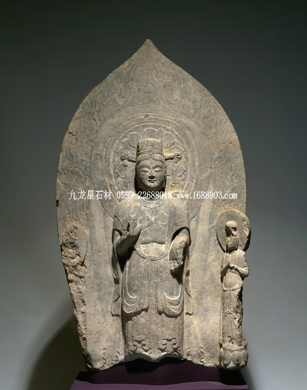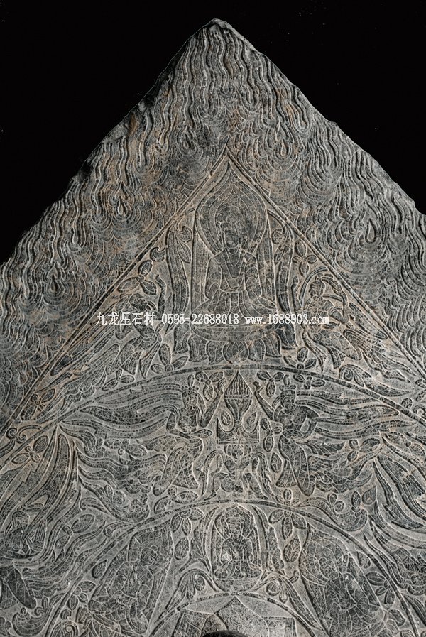 石碑正面雕一佛二菩薩,菩薩腳邊有護法獅子,現(xiàn)只剩殘體。佛和菩薩面相清瘦,身軀修長,頭部和手腳近似圓雕,佛裝則以高淺浮雕展示不同層次。如佛身上的漢化褒衣博帶式袈裟和衣裙腳部重疊衣褶的造型。他們身后是火焰形大背光,上面用減地陽刻和陰刻手法由中心向外畫出五個裝飾圈。中心圈是佛的頭光,內(nèi)有蓮花瓣;旁圈里是過去七佛;再外圈有六身飛天環(huán)繞,上部有一人形神獸頂一香爐,飛天或持蓮苞、香熏和樂器,姿態(tài)飄逸清揚;在此圈的尖頭部分又畫出第四圈,內(nèi)含一佛像,禪定趺坐于蓮花寶座上,側(cè)脅兩個飛天;最外圈是飛動的火焰圖案。