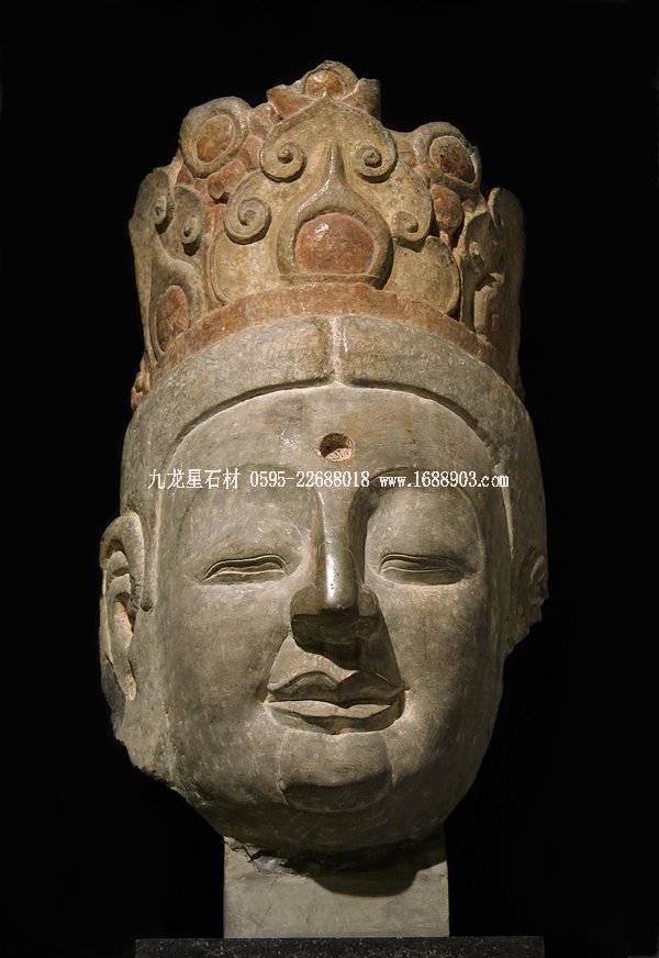 大勢至是西方極樂世界阿彌陀佛的右脅侍菩薩,和左脅侍觀音菩薩及阿彌陀佛,合稱“西方三圣”。大勢至的形象,多是頭戴寶冠,冠中有寶瓶。館藏的北齊大勢至菩薩臉型圓潤,豐唇滿頰。大拱形彎眉之下是細長的雙眼,用細線勾出雙層上眼瞼,抿嘴輕笑,又刻意雕出豐實的下巴。這些獨特的造型和技法與河北省響堂山石窟的同時代造像完全相同,應是原屬于該窟的造像。頭像神態(tài)自信怡然,制作相當精美,是北齊石雕像中的佼佼者。