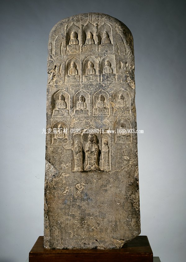 佛造像碑,西魏,公元549年,石灰?guī)r館藏的西魏石碑集兩種造像碑式樣于一體,即雙面數(shù)層佛龕式和千佛碑式。石碑正面是三段式構圖。上段用減地陽刻加陰刻的技法刻畫出維摩詰居士和文殊菩薩論法圖。人物刻畫秀骨清風,頗有魏晉名士風流之韻。