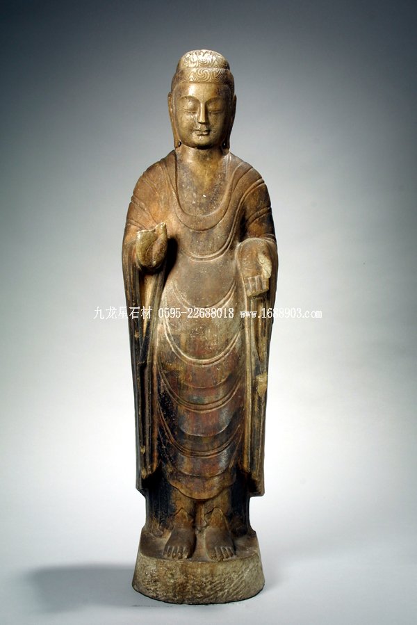 20世紀50年代在河北省曲陽縣修德寺發(fā)掘出兩千余尊石造像,其中多有北齊和隋朝的紀年造像。曲陽(古屬定州)一帶盛產(chǎn)大理石,在6世紀時已是佛像制作中心之一,至今仍有“雕刻之鄉(xiāng)”的稱謂。館藏思維彌勒像和立佛像,從材質(zhì)和風格來看,應歸屬于同時代的當?shù)刈髌?。立佛像身軀雖然仍較扁平,但總體輪廓線圓潤,腹部微向前凸起,增添了視覺上的體積感。佛著通肩袈裟,衣薄貼體,U形衣紋用雙鉤陰線,平行下垂的間距遞減,富有節(jié)奏感,為同類作品所罕見。佛左手施與愿印,右手施無畏印,有漩渦發(fā)型,高肉髻,臉形方圓,面容親切,是北齊佛像的精品。