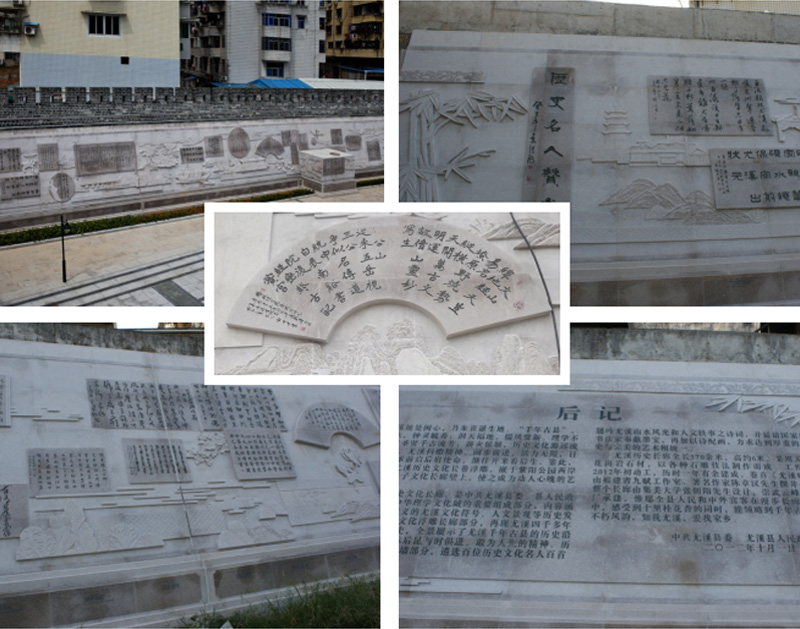 浮雕墻設(shè)計內(nèi)容:1、尤溪賦;2、歷史文化墻為:拓土開疆、高伏獻圖、開元建縣、盧珖守城、宋咸治縣、林積還珠、沈括謫尤、金屬冶煉、韋齋舊治、一代宗師、重教興學(xué)、居敬孝道、凌輝治吏、田頊博學(xué)、詹榮護國、瓜瓞聯(lián)芳、譫思為政、民俗風(fēng)情、紅軍入境、淞滬請纓、和平解放、山鄉(xiāng)巨變、走向未來