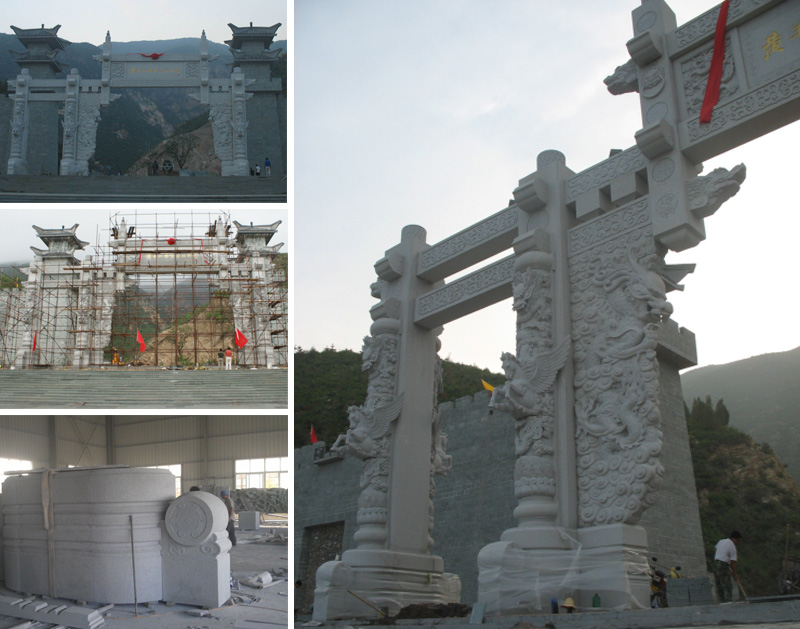 黃羊山大牌坊位于河北省涿鹿縣黃羊山國家公園,黃羊山大牌坊以中國傳統(tǒng)元素、龍及中華吉祥圖騰作為元素設計加工制作而成,整座牌坊高15米,寬25.4米,采用芝麻灰花崗巖整石制作,牌坊連接拼裝為傳統(tǒng)石卯榫結構,最大單塊重量60噸左右,加工,運輸,安裝難度極大,云峰公司克服了設計,制作,運輸,安裝等種種困難因素制作而成,使其成為石牌坊中的經典工程。