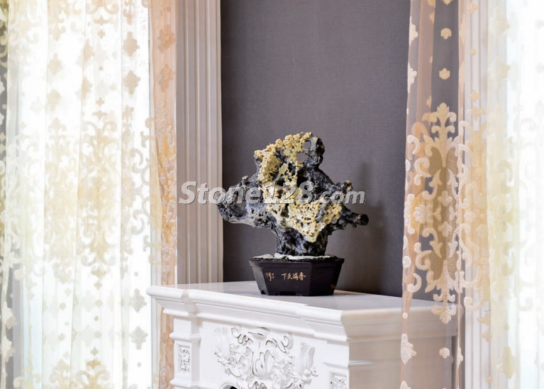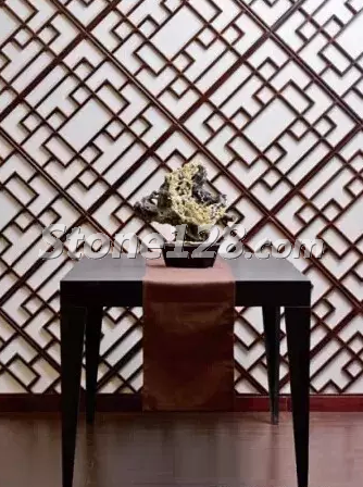 在新中式風(fēng)格的大廳中,石雕作品的外形與背景窗花的菱形相互協(xié)調(diào),取得了很好的諧調(diào)效果。石雕的色彩與整體環(huán)境的深色調(diào)相互統(tǒng)一,臘梅花典雅的黃色又活躍了色彩的意境氛圍。整體空間的直線風(fēng)格與石雕作品的曲線造型相對(duì)比,剛?cè)嵯酀?jì),收放有度,取得了很好的視覺(jué)效果。
