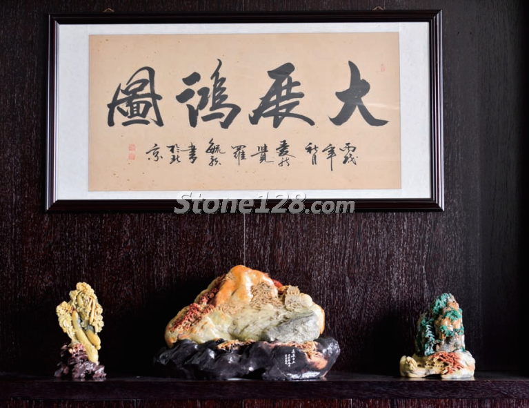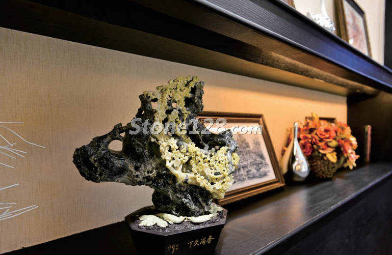 在內(nèi)室陳列柜上放置石雕作品,暖色的背景與燈光相融合,溫和的造型與豐富的陳列物品相諧調(diào),充分體現(xiàn)了這件石雕作品中溫馨典雅的內(nèi)涵。