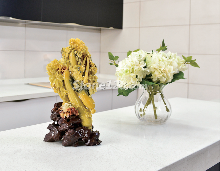 擺放在餐廳,既有美滿和諧的氛圍,又有艱苦奮斗的寓意。作品的曲線造型與餐廳環(huán)境的直線造型相互彌補(bǔ),中和了各自的不足。深色的餐桌及背景很好地襯托了淺色的石雕作品,給整個(gè)空間注入了生命力。