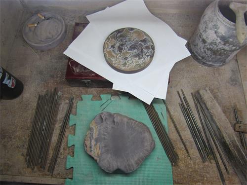 工作臺(tái)上放著一方尚未完工的硯臺(tái),是幾朵的蘑菇的形態(tài)。應(yīng)調(diào)研團(tuán)成員的要求,胡楊老師給調(diào)研團(tuán)的成員們展示了現(xiàn)場(chǎng)雕刻,他用一根細(xì)長(zhǎng)頭尖的鑿子輕輕地雕刻一只爬在蘑菇上的螞蟻,每一鑿,不論力度還是位置都十分精準(zhǔn),令調(diào)研團(tuán)成員非常欽佩贊嘆。胡楊老師表示自己還是很向往大師陳端友歷時(shí)三十載制成九龜荷葉形端硯的精雕細(xì)琢,他們應(yīng)該將生活節(jié)奏放慢,只有摒棄五光十色的浮華,寧靜淡泊,才可以在石雕雕刻的道路上有所感悟、有所收獲。