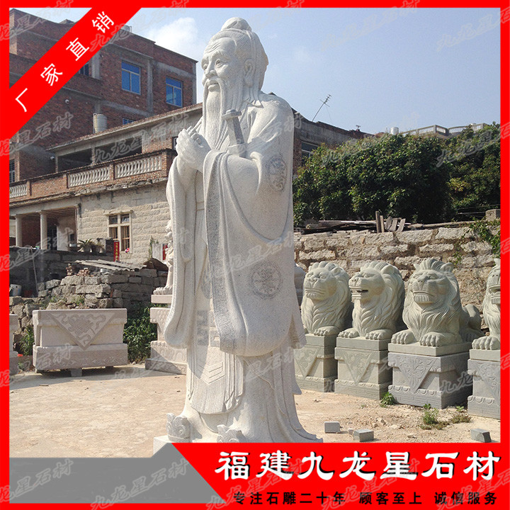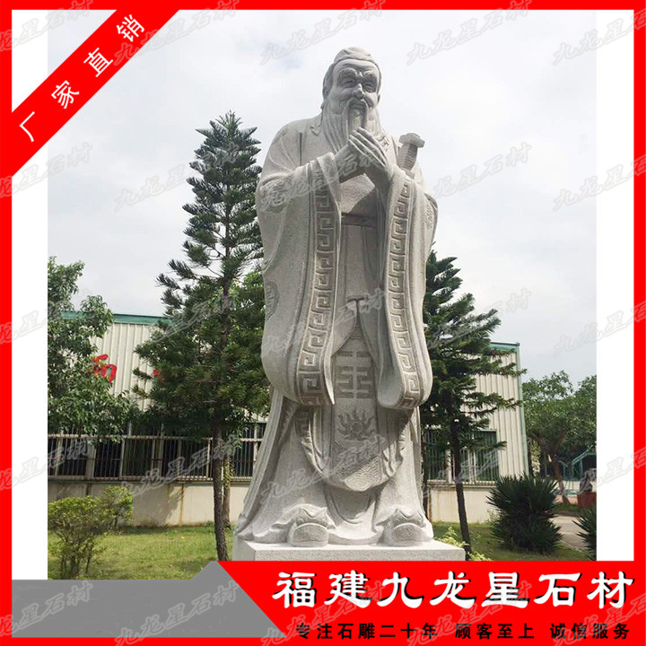 孔子石雕像樣式選擇性不算太大,現(xiàn)在我們看到的孔子形象大多是根據(jù)唐朝的吳道子所畫的孔子像來進(jìn)行創(chuàng)作雕刻的,長眉長須,身著寬大的儒服,衣袂飄飄,栩栩如生,因此非??简?yàn)雕刻師傅的工藝,達(dá)到石雕像的真實(shí)感,表情惟妙惟肖。一般比較常見的孔子石雕像有比較簡單的頭像,也有站姿的石雕像,基本上站立姿勢的石雕像選擇性更受到人們喜愛,有手里握著書卷拿在胸前,一手背在身后,抬頭挺胸,眼神眺望的石像,也有將雙手交叉并在胸前,但是我們可以看到交疊的手是不露出大拇指的,象征著謙恭有禮,而四指并攏,也代表著四海之內(nèi)皆兄弟,有著友愛、友誼的象征意義。