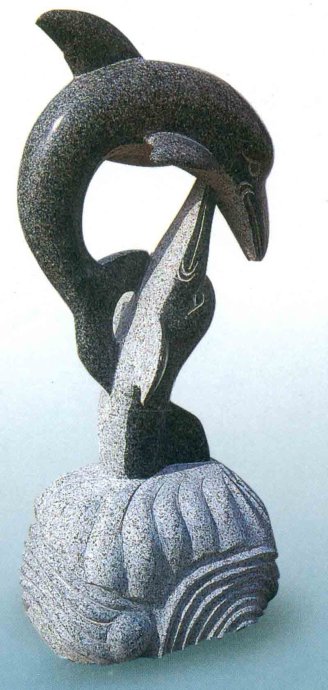 此尊石雕海豚作品創(chuàng)意來(lái)自于“海豚戲水”。高約1.6米。
